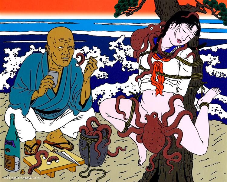 Разумеется, подобное сочетание эротики и графического насилия в японском искусстве существовало и до всплеска популярности этого направления в XX веке. Например, мастер укиё-э XIX века Цукиока Ёситоси известен серией «28 убийств в стихах» — яркими, детализированными и прекрасными изображениями чудовищных преступлений, совершённых историческими личностями. Однако именно взрыв популярности эро-гуро как литературного и художественного движения в начале XX века и его последующее возрождение с 1950-х годов подтолкнули художников эпохи эро-гуро середины столетия к тому, чтобы расширить границы дозволенного, создавая всё более рискованные и опасные работы в стране под политическим и экономическим надзором США.