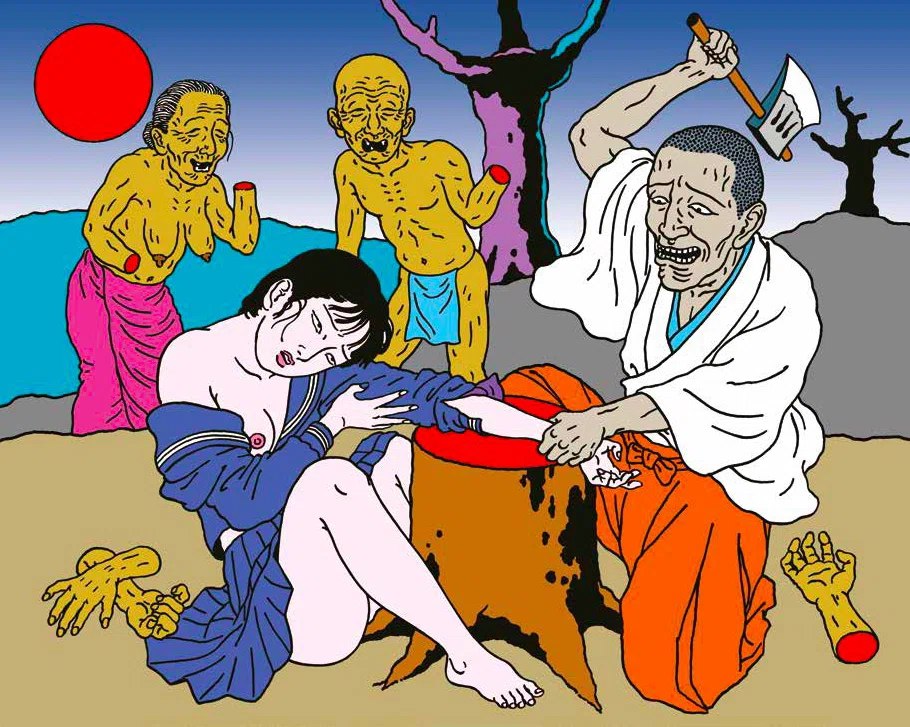 На одной из иллюстраций Саэки мужчина готов отрубить руку юной девушка, а на заднем плане ликуют безрукие старики. Эту работу можно трактовать как комментарий к женской автономии: мужчина калечит женщину, чтобы взять её под свой контроль. Его предки одобряют его действия, ведь он следует их примеру. Сравните это с трансформацией Хинако в «ином мире»: игра использует схожие образы, связанные с освобождением и контролем, но идёт ещё дальше, наделяя Хинако иллюзией власти.